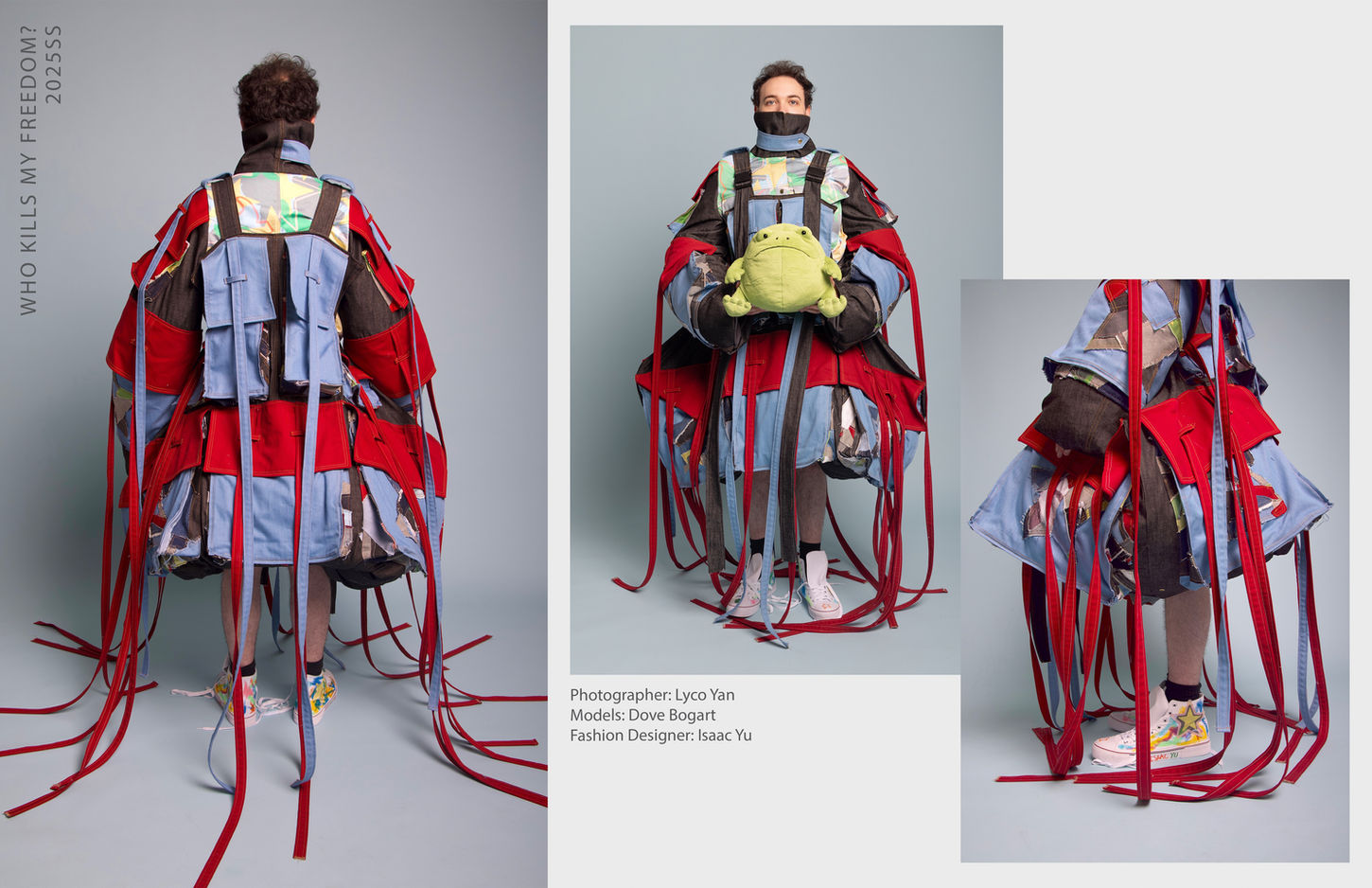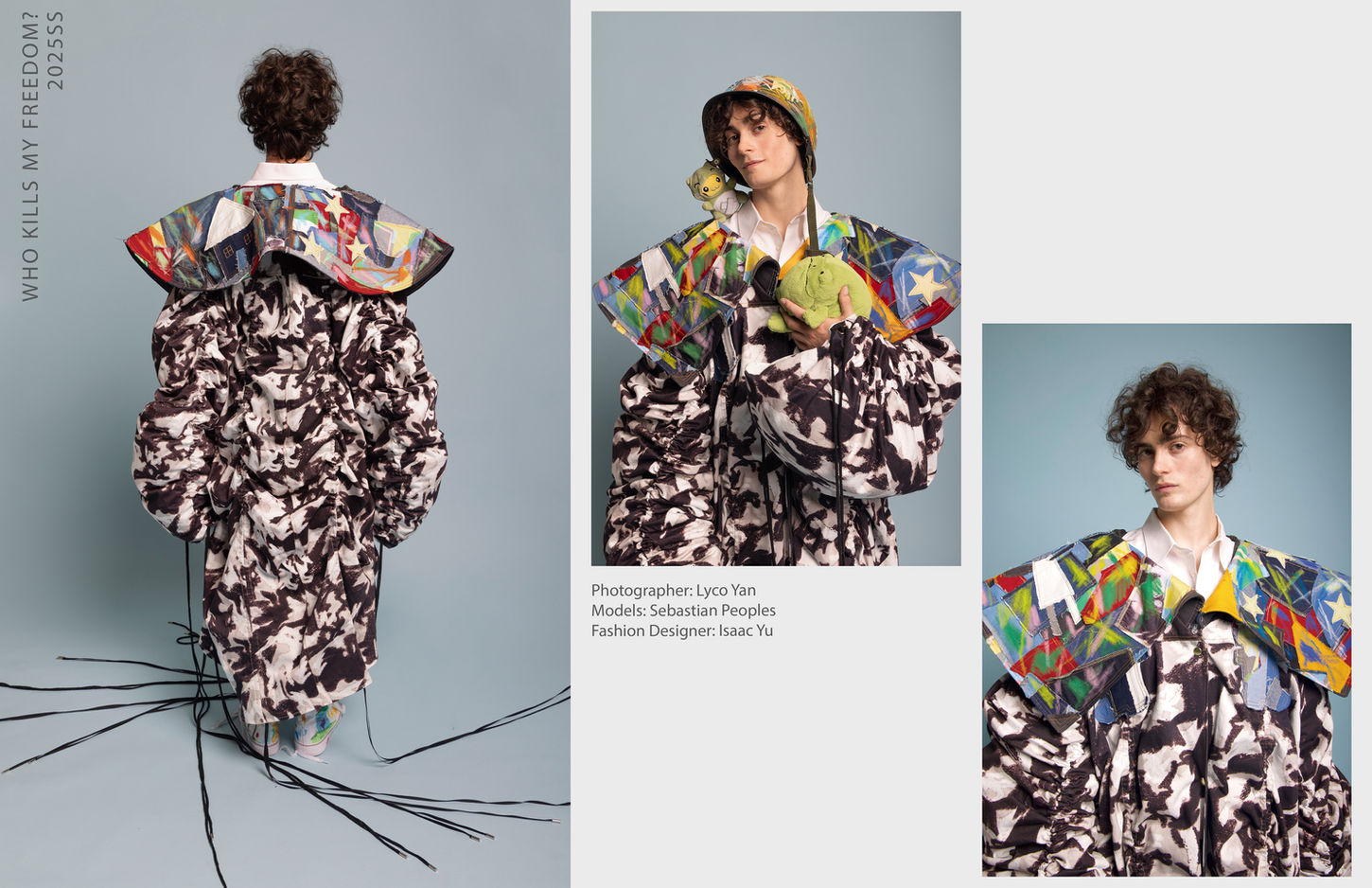 “Who Kills My Freedom?” is an innovative 2025 men’s streetwear SS collection that serves as a personal odyssey— bridging the rigid discipline of Taiwanese military service with the boundless imagination of my childhood. I grew up surrounded by love and freedom, encouraged by my parents to create, play, and dream without limits. But in the military, that freedom was replaced with structure and silence. My identity blurred beneath the weight of uniformity, until I discovered fashion.